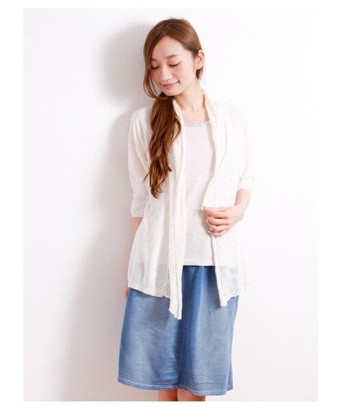 透かし編みニットをフロントショール部分にあてた7分袖シアーカーディガンです。ひらっとしたニュアンスとスカシニットがリゾートムード、ハイゲージ編みのシャリのある素材が涼やかで夏に最適です。涼感を保ちつつ羽織れるトッパーはマストバイです。【モデル身長:約169cm/着用サイズ:Fサイズ】