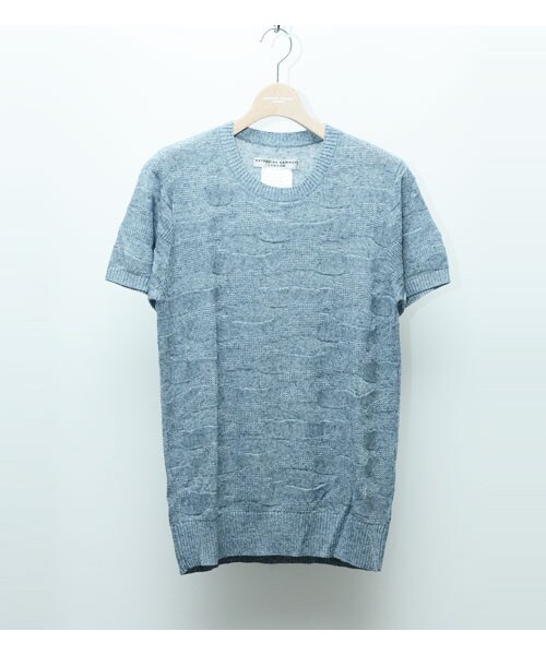 麻混素材を使用したニットTシャツ。清涼感のある糸とメランジ調のカラー(ブルー、ベージュ)が特徴です。身頃はカモフラージュ柄の編み地になっており、無地調でありながらこだわりのある柄に仕上がっています。Tシャツやシャツなどをインナーに使用してご着用頂くスタイリングがオススメです。レディースバージョンはコチラ【素材】レーヨン68%、麻20%、ナイロン12%