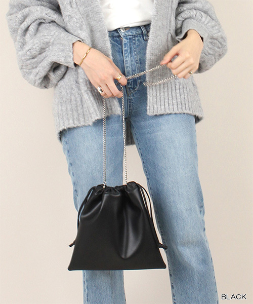 ◆2019AW新商品◆コーディネートのアクセントになるトレンドの巾着バッグ。手持ちはもちろん、チェーンのショルダーが付いているので2WAYでお使いいただけます。チェーンがキレイめな雰囲気にも馴染むので、スタイリングの幅が広がるアイテムです。