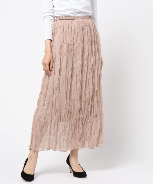 細かなワッシャー(シワ)加工が施されたオーガンジーロングスカート。 少し光沢のあるアリーナオーガンジーを使用しております。シワ加工を施しておりますので座りじわも、洗濯じわも気にならないのが◎ 秋冬は全体的に重くなりがちなので、軽さを取り入れられるのが嬉しいアイテムです♪ レディライクなスカートにはTシャツやスウェットを合わせてカジュアルダウンさせた着こなしがおすすめです。