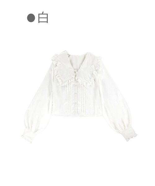 シルキータッチで上品な素材感 パール釦でエレガントな品質がさらに引き立つ ジャンスカorパンツ、ニットでも どんな単品とも合わせやすい定番HOTアイテム 大胆でクラシカルなBIGフリル襟 360度抜け目のない可愛さでデザイン勝負 「白」と「ピンク」の2色展開