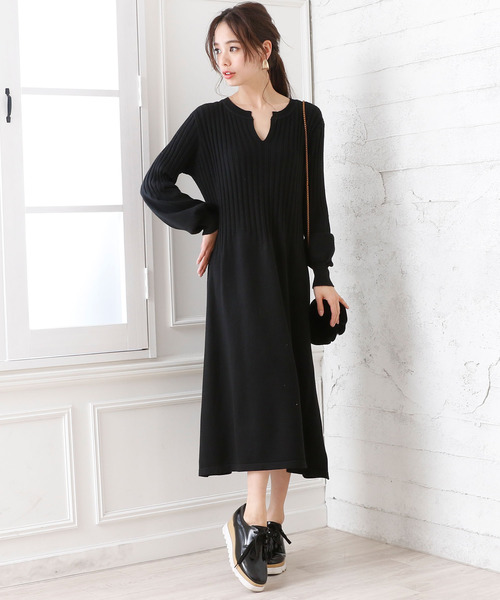 程よいワイドリブの縦ラインですっきり着こなせるロングニットワンピース。スッと開いたVネックとボリューム感のある袖が女性らしさを引き立てます。シルエットが綺麗なので上品な仕上がりに。ブーツやバレエシューズはもちろん、カジュアルにスニーカーで合わせてもいいのでデイリー使いしやすい1着。※画像の商品はサンプルです。実際の商品と色味、仕様、加工、サイズ、素材等が若干異なる場合がございます。 ※工場の生産の都合上、納期が変更になる場合がございます。