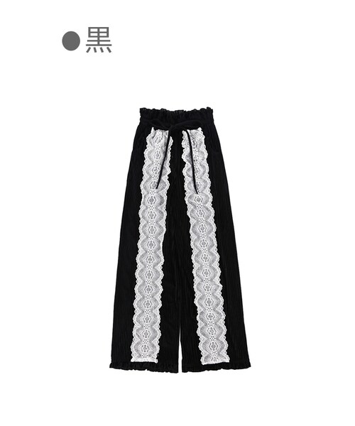 ベロアのような光沢感ある秋冬生地を使用 起毛素材だから手触り感もGOOD パンツ部分はプリーツ加工を施し 縦ラインを強調するためレースON ハイウエストでさらに足長効果狙い 美しい落ち感&すっきりシルエットで美脚魅せ! 「黒」と「ピンク」の2色展開