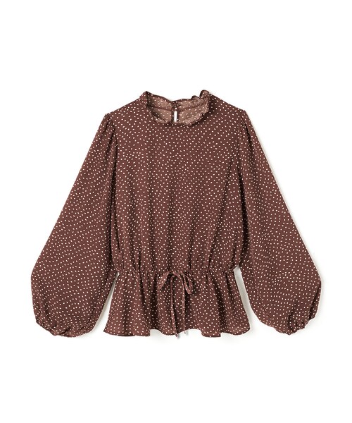 程よい大きさのドットが大人可愛い印象与えるブラウス。 フリルネックがクラシカルなアクセントに。 ウエストドロストリボンでシルエットにメリハリをプラス。 合わせるアイテム次第でカジュアルにも上品にも着回せる万能な1枚。 ★裁断の関係で、柄の出方が写真と多少異なる場合があります。