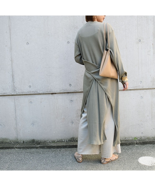 ◆アイテム詳細◆ 柔らかく肌当たりの良い生地感のリブロングワンピースです。 リブデザインなので野暮ったくならず、すっきり女性らしいシルエットで着ていただけます。 1枚で様になるシルエットなのはもちろん、ラップドレス仕様なので、お好みの位置で腰巻を変えることにより色々なパターンでの着回しが出来るデザインワンピースです。 デニムやワイドパンツとのレイヤードスタイルにオススメのアイテムです。 [こちらから着こなしの3パターン動画をご紹介してます]↓ https://youtu.be/nibobJUET_M ーーーーーーーーーーーーーーーーーー 【COLOR】アイボリー・カーキ・ブラック 【SIZE】Fサイズ 平置き(㎝) 着丈122 身幅53 肩幅49 袖丈54 裾幅57 【素材】本体 綿50% ポリエステル50%