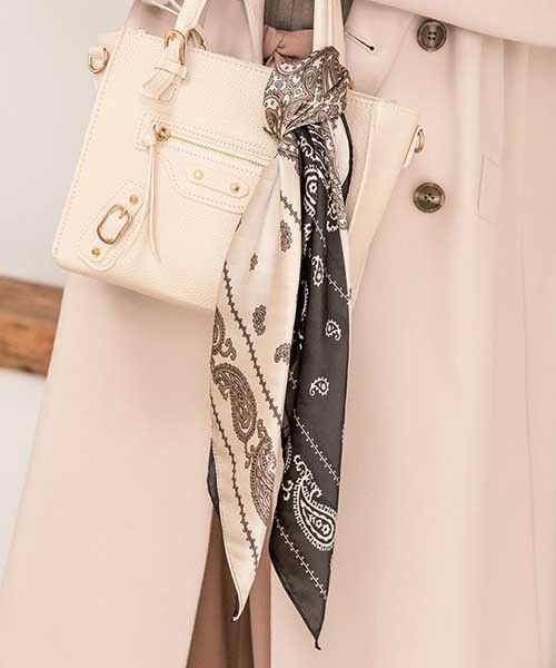 多彩なアレンジで、装いをセンス良くブラッシュアップ バイカラーでキャッチーに仕上げたペイズリー柄プリントスカーフ。合わせやすいモノトーンの配色で、大人顔な印象に仕上げました。首に巻いたりベルトにしたり、ヘアアクセサリーやバッグのアクセントにと、スタイリングの一部に取り入れて楽しめます。 【モデル着用カラー】バイカラー
