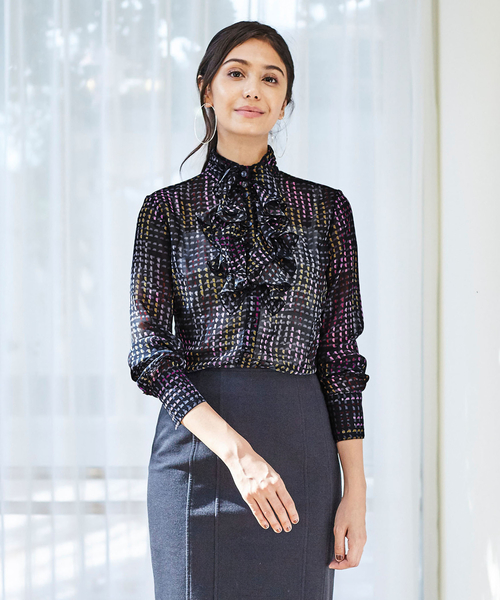 ジオメトリックな変形チェック柄が秋冬シーズンのスタイリングに馴染む長袖ブラウスです。パウダリーなタッチで、肌触りの良いシフォン素材を使用しました。シンプルな柄のようでありながら複雑にカラーをミックスすることで、単調に見えない色目に仕上げています。フロントには、ナラカミーチェらしいボリュームのあるフリルを施しました。・ストレッチなし・透け感あり・カラー展開はブラック(黒)、パープル・サイズ展開は0(S)7号・1(M)9号・2(L)11号【 NARA CAMICIE 】イタリア生まれのシャツ・ブラウスブランドNARA CAMICIE(ナラ カミーチェ)レディースを中心に、イタリアならではの豊富なデザインと多彩なカラーバリエーション、女性らしく見せる立体的パターンで美しいシルエットが特徴です。シャープなシャツからフリルやレースをあしらったブラウスはスーツのインナーやオフィス、フォーマルなコーデと幅広く活躍!●お買い物をお得にもっと楽しく!上手な活用方法>>>▼商品のお気に入り登録▼完売カラーの再入荷通知や、ラスト1点の通知、プライスダウンしたセール通知も受け取ることができます。▼ブランドのお気に入り登録▼新作や再入荷等、いち早くブランドのお得な情報を受け取ることができます。