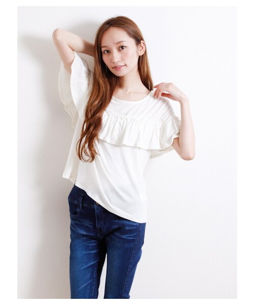 繊細でボリュームのあるフリルが存在感たっぷり、ミックスプルオーバーです。バストから袖にかけてくしゅっとギャザーフリルをあしらいました。薄手のカットソー地で滑らか且つ清涼な肌あたりです。カジュアルめなボトムス合わせで好バランスな着こなしがお勧めです。※インナー着用【モデル身長:約169cm/着用サイズ:Fサイズ】