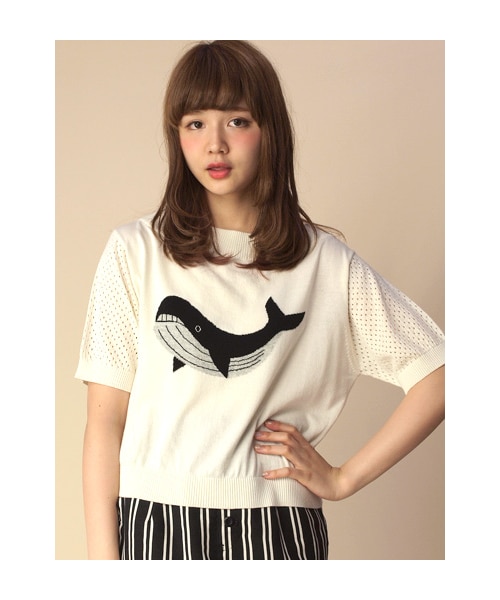 大人気だったアイテムの半袖バージョンが登場。ジャガード編みのクジラが可愛いサマーニットです。袖部分が透かし柄になっており、大人に着ていただけるところもポイントです。