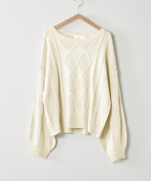 女性らしい雰囲気のケーブルニット。ボリュームのある袖とクルーネックが絶妙なバランスの一枚です。秋冬にニュアンスパステルカラーで暗くなりがちな冬のコーデを華やかに。春先まで使えるニットです。