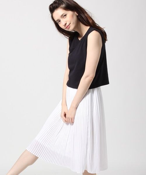 ミディ丈のプリーツスカートとボーダータンクトップのセットアイテム。トレンドスタイルが1枚で完成するのが◎勿論、別々でも着られるので着回しの効く1枚です☆