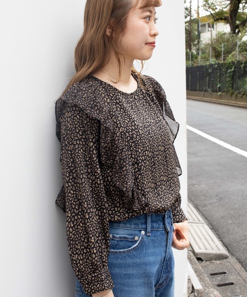 女性らしさを引き立てるレオパードブラウス♪身頃にあしらったフリルは透けるシフォン生地を使用し、軽やかでシアーな雰囲気に仕上げました。シワ加工された表情のあるフリルが甘い雰囲気になりすぎず大人ガーリーなスタイリングにぴったり!華やかに見せてくれつつ、さりげなく肩回りをカバーしてくれて華奢見えも叶う1枚です。今季トレンドのフレアパンツと相性◎!デニムやスキニーと合わせたブラウスが映えるスタイリングもおすすめです。