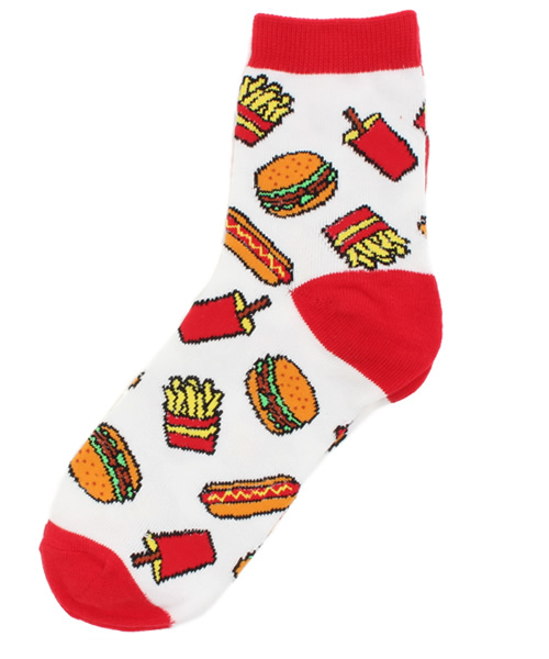 遊び心あるデザインのソックス。柔らかく脚のラインにフィットし、ストレスなく着用して頂けます。今季はミニボトムにスニーカーなど、MIX感ある着こなしもオススメ。また、お値段も手頃でご自身用は勿論、プレゼントにもオススメです。 店舗にてお問い合わせの際は、下記の品名・品番をお申し付け下さい。品名:バーガーソックスRE 品番:BLSG14SM-128 WEGOの特集ページはコチラ