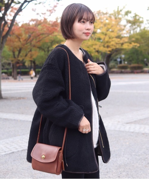 フェイクレザーのトリミングがポイントになったボアコート。 ノーカラーデザインですっきりときれい見えするデザイン。ウエストのゴムをぎゅっと絞ればすっきりしたシルエットで着られるのも◎ 着まわしやすいアウターです。