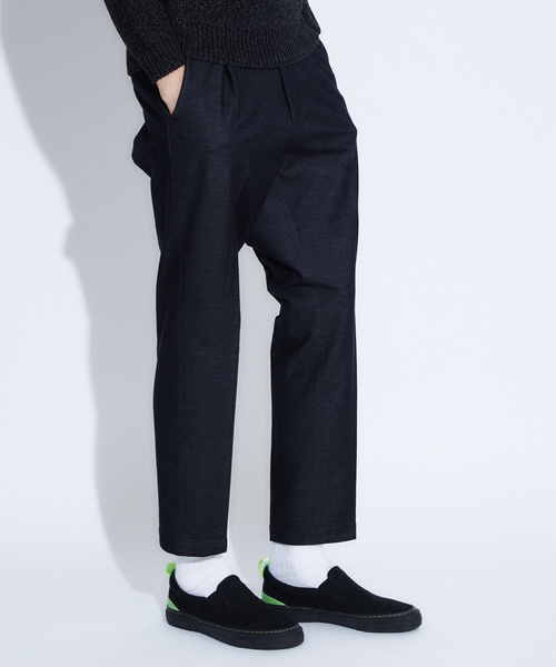 スマートなシルエットに程よい生地の光沢感【素材】ハリのあるジャージ素材「モクロディ」を使用したジャケット。ジャージ素材なのでストレッチ性があり、ふっくらとした柔らかみも兼ねそなえています。【デザイン】プリーツの入ったスリムテーパードシルエットで、程よい生地の光沢感がポイントです。カジュアルからビジネスシーンにも対応。今季取り入れたいベージュカラーに定番のブラックとネイビーの3色展開。同素材ジャケット(品番:品番:71399382000)もございます。【コーディネート】セットアップでの着用がオススメ。
