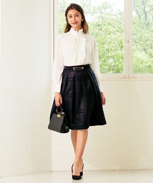 ラメ糸が織り込まれた、変形チェックのジャカード織りスカートです。コンサバティブな品のあるデザインの中にも、きらりと光るラメがポイントに。エレガントなタックデザインで、広がりすぎないほどよいシルエットが大人っぽさを引き立てます。落ち着きのある膝丈で合わせるトップスを選びません。通勤からプライベートまで幅広く活躍します。・モデル画像にて着用のベルトは別売となります。・裏地あり・後ろファスナー・カラー展開はブラック(黒)・サイズ展開は0(S)7号・1(M)9号・2(L)11号【 NARA CAMICIE 】イタリア生まれのシャツ・ブラウスブランドNARA CAMICIE(ナラ カミーチェ)レディースを中心に、イタリアならではの豊富なデザインと多彩なカラーバリエーション、女性らしく見せる立体的パターンで美しいシルエットが特徴です。シャープなシャツからフリルやレースをあしらったブラウスはスーツのインナーやオフィス、フォーマルなコーデと幅広く活躍!●お買い物をお得にもっと楽しく!上手な活用方法>>>▼商品のお気に入り登録▼完売カラーの再入荷通知や、ラスト1点の通知、プライスダウンしたセール通知も受け取ることができます。▼ブランドのお気に入り登録▼新作や再入荷等、いち早くブランドのお得な情報を受け取ることができます。
