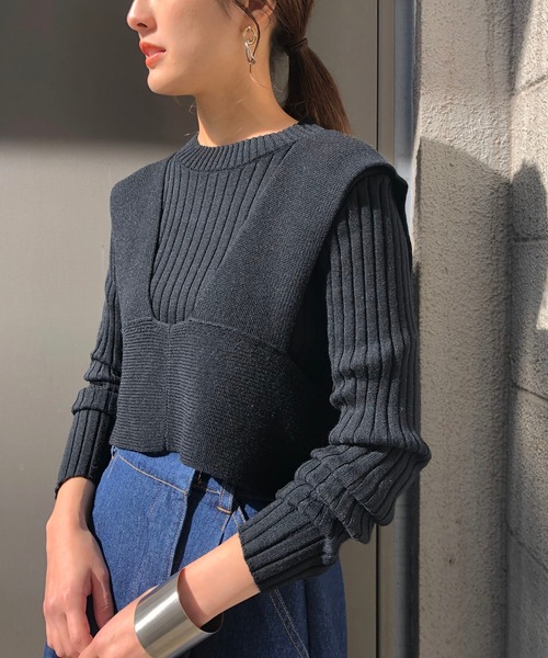 様々なレイヤードスタイルが楽しめる お洒落なレイヤードスタイルが即完成するセットアイテム。 ビスチェとリブニットは単体使いも可能なので、 シーンに合わせて様々な着こなしが楽しめます。 インナー ビスチェ 着丈:60cm 着丈:36cm 身幅:38cm 身幅:40cm 肩幅:36cm 肩幅:42m 袖丈:56cm