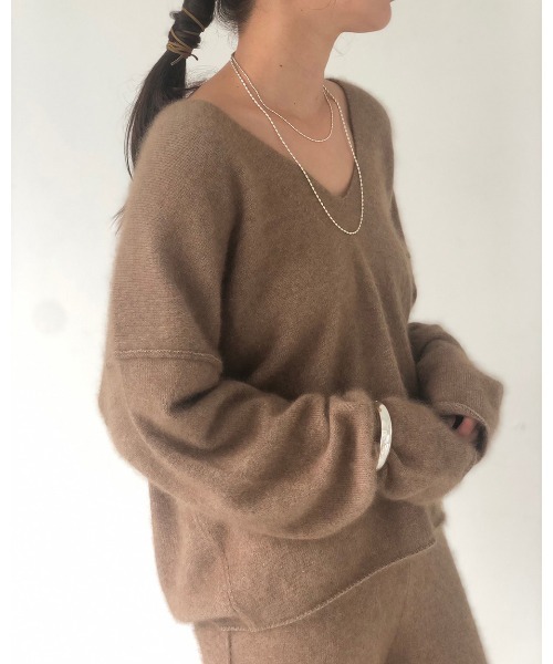 ラクーンと同様に上質素材として知られるラクーンの糸を使用した肌触り抜群のニット。とても軽くなめらかで、保温性にも優れており、ずっと着ておきたいと思えるような1着です。デコルテが見えるVネックデザインが女性らしく抜け感を出してくれます。