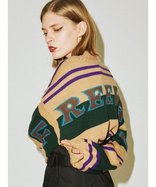 バックBIGロゴをジャガードと刺繍で表現したニット。袖のボリュームがかわいさを演出してくれます。ボディカラーによって異なるロゴカラーもうれしいポイント。オーバーサイズでゆるっとしたシルエットなのでスキニーやデニムと合わせるのがおすすめです。