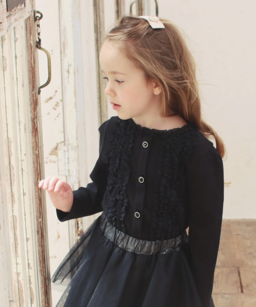 ■商品説明:フリルとフェイクボタンがさりげなく光るカーディガン風のブラックロンT。細めのラウンドネックの周りと前身頃にフリルを配し、黒いTシャツに可愛らしさと華やかさを加えました。ジュエリーのようなカットのボタンもブラックに統一し、複数の同色の異素材を組み合わせることで着るだけのトップスが単調にならず、こなれた雰囲気のコーディネートが完成します。12月16日に価格変更を行います。ご了承くださいませ。■洗濯方法レースを綺麗に保つために、ネットに入れてお洗濯されることをお勧めします。