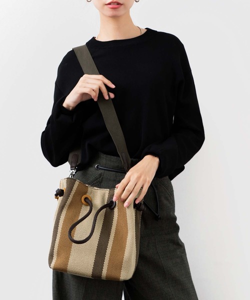 【デザイン】ストライプ2way巾着ショルダーバッグ太めのストライプが目を引く巾着型2wayショルダーバッグ。リネンとコットンを合わせた糸を編み込んだ生地をふんだんに使用し、年中使える素材感で仕上げたバケットバッグ。持ち手を強く引っ張り、開閉口を絞って持つと巾着型に、絞らず持つとトートのフォルムに。付属のショルダーベルトで、斜め掛け・肩掛けができるのもうれしいポイント。コーディネートのアクセントになる、オシャレなバッグです。【仕様】・しっかりマチがあり収納力は◎・バッグの中にはすぐに取り出せるオープンポケットが2つ。・貴重品の収納に便利なファスナー付きポケットが1つ。・メイン収納の開閉口はマグネット仕様に。ストラップの長さ調整不可能です。(取り外し可能)内側ポケット:3 【注意事項】合成皮革特有のにおいがする場合がござます。においが気になる場合は一度陰干しされてからご使用ください。 ◆商品のお気に入り登録◆完売カラーの再入荷通知や、ラスト1点の通知、セールの通知も受け取ることができますので、是非ご登録ください。◆ブランドのお気に入り登録◆新商品や再入荷などの情報を受け取ることができますので、是非ご登録ください。