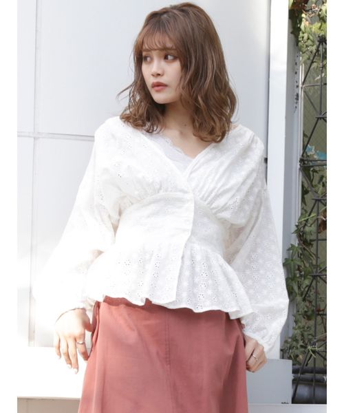 ふんわりした身頃や袖とウエストシェイプのコントラストがかわいいブラウス。 使用しているコットンレースに透け感があるのでインナーでスタイリングを楽しむことのできます。 パンツと着合わせてもしっかり女性らしさを出してくれます。 ざっくり開いた後ろ衿も共生地リボンがアクセントになってくれます。 さりげなく肌見せしたくなる季節に着やすいとっておきの一枚です。 【スタイリングコメント】 コットンレースに透け感があるのでインナーでカラー見せしてスタイリングを楽しむことができます。 デニムでヘルシーさを演出、コットンレースのふわっと感がしっかり女性らしさを出してくれます。