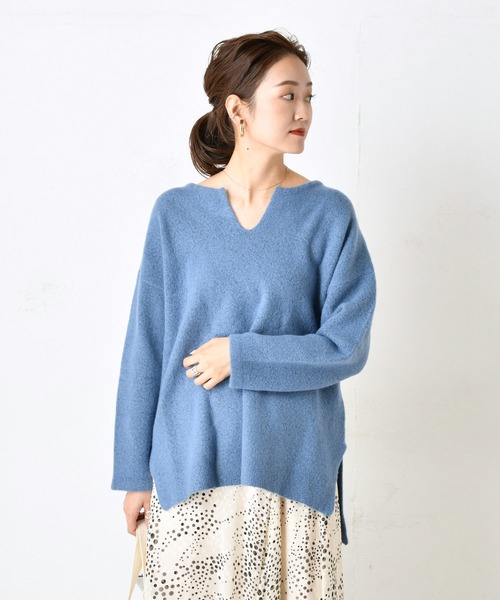 キーネックで肌のチラ見せが女性らしさをグッとアップしてくれるニットプルオーバー。前後差のあるヘムラインなので、フロントインスタイルも楽しめます。ロングスカートやテーパードパンツとも相性抜群。コーディネートの幅が広いのでワードローブに揃えておきたい一枚です。