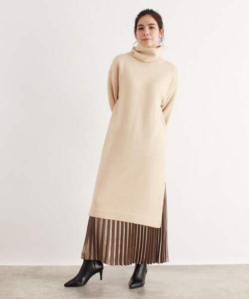 【デザイン】ゆとりのあるボディとゆるいコクーンシルエットが美バランスを生みだすニットワンピース。ふんわりと広がったバルーンスリーブが愛らしい雰囲気。ネックラインはお顔まわりに女性らしさとニュアンスを運ぶオフタートルで仕上げました。着丈は足元まで届くロング丈。サイドに入ったスリットがさりげないヌケ感を演出します。【生地感】これからの季節に活躍してくれる暖かみのある肉厚な生地感です。※コーディネートのプリーツスカートは別売りです。