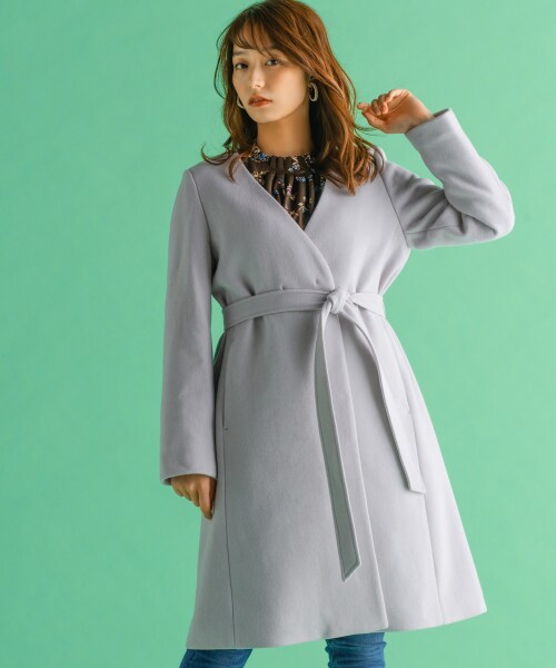 まとうだけで気品が漂う、レディなノーカラーコート。流れるようなVネックが、着流してもサマになるポイント。ウエストにリボンベルトをきゅっと結べば、女性らしい立体的なシルエットに。柔らかなカラー展開も注目です。