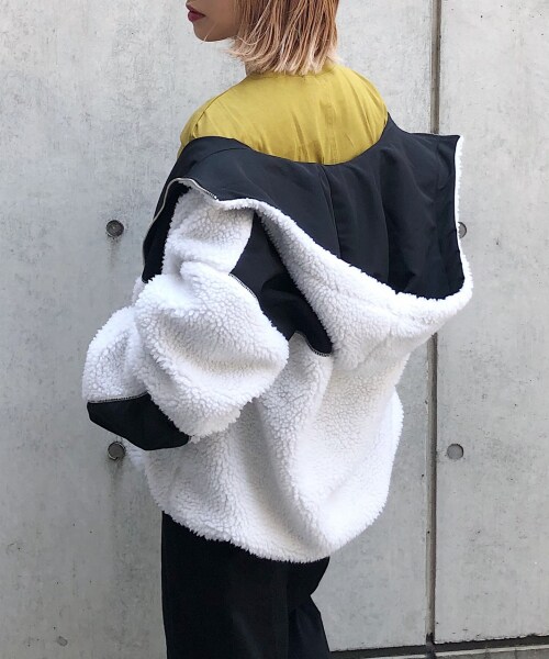 軽くて暖かいトレンド感のあるボアを使用したアウターブルゾン。表面はボアと布帛の配色切り替え、裏返すとシンプルなナイロンブルゾンとしても使用できる2WAYリバーシブル使用!フードデザインが今季の気分にピッタリ。裾のヒモを絞ってボリューム感を出したりとシルエットに変化をつけれます。少しBIGなサイズ感と手首が隠れる袖丈やたっぷりしたボリューム感が可愛く、中に着込めるので冬まで着回せるアイテムです。少し襟を抜いた着方がおすすめです。※撮影環境により、光の当たり具合で 色味が違って見える場合があります。 あらかじめご了承下さい。