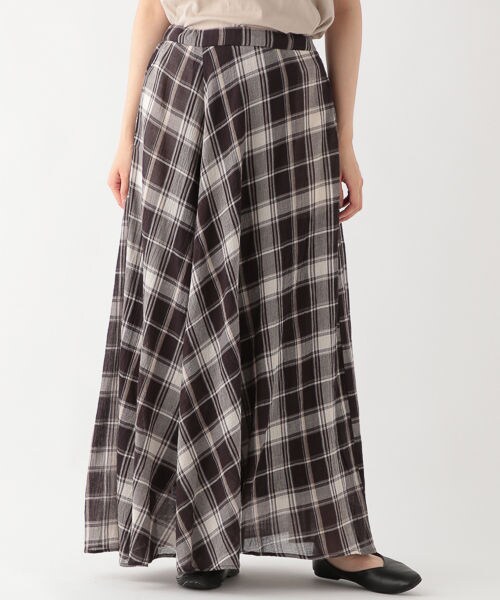 綿100%のシャリみのある強撚糸を使用したマキシスカート。大きめのオリジナルのバイアスチェックが今年らしいアイテムです。ウエストイージータイプで着脱しやすく、また前スカートはギャザーが入っていないのですっきりと着用いただけます。カジュアルにTシャツ合わせがおすすめです。