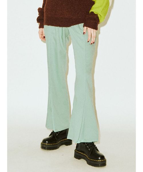 シースルー切り替えが新しいフレアパンツ。中心に切り替えが入っているので、足長効果が期待できます。 形はシンプルなので、どんなトップスでも合わせやすいアイテムです。