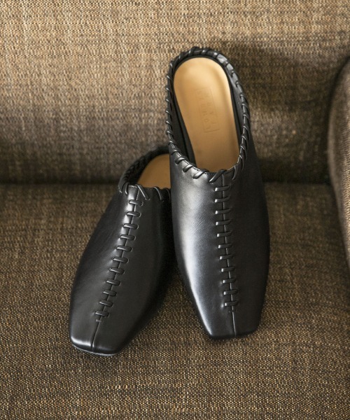 アッパーと履き口のカガリ縫いデザインが特徴的なミュール。かかとのないつっかけ仕様なので楽に履いて頂けます。縫い目がアクセントになるのでシンプル過ぎず、コーディネートのポイントになってくれます。素足でもソックス合わせでもかわいいシューズになっています。※商品の仕入れや発送の際に、シューズの箱が破損してしまう場合があります。商品自体に問題はありませんが、ご了承いただける方のみ御購入をお願い致します。