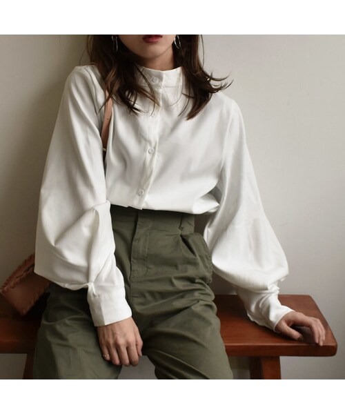 バンドカラーのネックでモードな印象のブラウスです。オーバーサイズのシルエットでリラックスした着心地が特徴です。 袖部分はタックになっており、自然とボリュームが出るデザインになっています。1枚でも存在感のあるトップスはコーディネートの主役になります。 (モデル身長166cm) ■素材 ポリエステル100% ■サイズ 総丈63cm 身幅50cm 袖丈59cm こちらは、クロネコ宅急便で発送商品になりますので、お届けまでに発送から1~2日かかります。