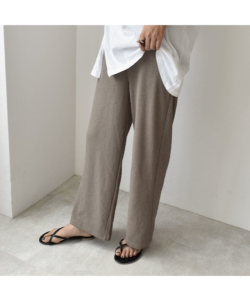 しゃり感のある素材で、ややワイドなシルエットのリブパンツです。ウエストはゴムでノンストレスなのも嬉しいポイント。 ワンピースの下やビックシルエットのトップスと相性抜群。 着回し力抜群なので、色違いでも持っておきたいアイテムです。夏の日差しが強い時期にも、着たくなるようなさらりと軽い生地感。太すぎないセミワイドのシルエットは、ルーズ過ぎずリラックス感を演出します。 ■モデル身長 画像1~4 チャコール 166cm 画像5~7 モカベージュ 152cm 画像8.9 エクリュ 166cm ■素材 ポリエステル72% レーヨン26% ポリウレタン2% ※エクリュカラーは濃色の下着の場合透けることがございます。 ■サイズ(S-Mサイズ対応) ウエスト(ゴム上がり)60cm ヒップ 94cm 股上 34cm 股下 63cm わたり 28.5cm 裾幅 24cm こちらは、ネコポス便発送商品になりますので、お届けまでに発送から1~2日かかります。