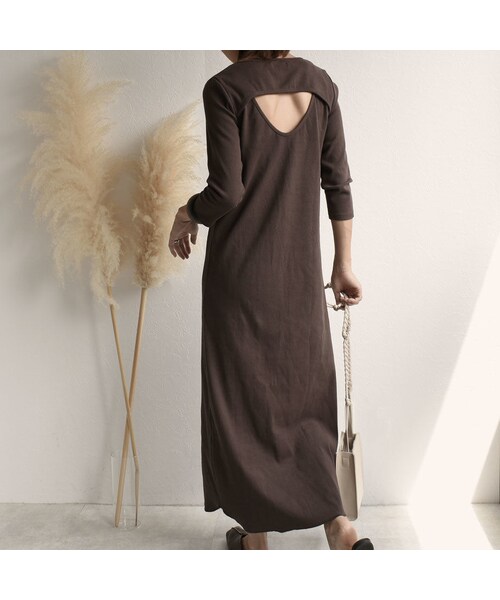made in japan 適度な保温性と高い吸水性があり、蒸れにくいリブ素材です。 バックコンシャスなデザインで1枚でさまになるのが魅力です。 サンダルで合わせたり、スニーカーでカジュアルダウンしても。 冬にはブーツで合わせるのもおすすめです。 袖は七分袖になります。 (モデル166cm) ■素材 綿100% ■サイズ 着丈128cm 身幅42cm 袖丈44cm 肩幅36cm こちらは、宅急便での発送商品になりますので、お届けまでに発送から1~2日かかります。