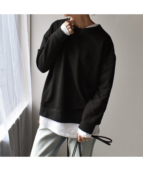 1枚でロンTと重ね着をしたようなレイヤードコーデが完成するスウェットトップスです。あえて斜めにカットされた裾部分や首元に少し見えるレイヤードTシャツなど、デザインもこだわっています。肌触りの良い素材感で伸縮性も良く着心地も抜群です。 程よいゆったり感で、メンズライクな雰囲気も◎ 裏起毛ではないので、春に丁度良い素材感です。 (モデル身長166cm) ■素材 綿85% ポリウレタン15% ■サイズ 身丈69 身幅58cm 袖丈51cm ※身丈と袖丈はレイヤード部分含んだ寸法になります こちらは、クロネコ宅急便で発送商品になりますので、お届けまでに発送から1~2日かかります。