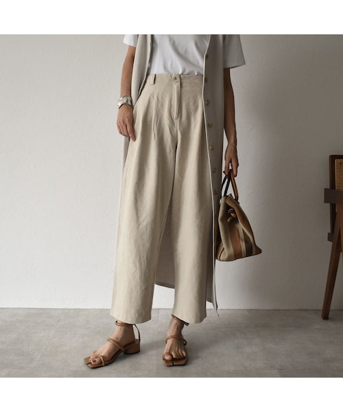 ナチュラルな風合いの麻混素材を使用した、ラスティックな雰囲気が今年らしいパンツです。ウエストバック部分はゴムになっているので着脱もらくちん。リネン特有のちくちく感もなくさらっとした履き心地。 (モデル身長166cm/Mサイズ着用) ■素材 コットン55% リネン45% ■サイズ★ 【Mサイズ/Lサイズ】 ウエスト 62cm/64cm ヒップ 106cm/114cm 股上 32cm/32cm 股下 65cm/67cm わたり 35cm/37cm 裾幅 21cm/22cm こちらは、クロネコ宅急便で発送商品になりますので、お届けまでに発送から1~2日かかります。
