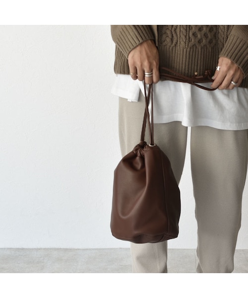 シンプルなデザインで、コーデを選ばずデイリールックで使えるエコレザー巾着バッグです。500mlのペットボトルがすっぽり収まる大きさで、使い勝手も良いです。 内側にはカードサイズのチャック付きポケットとオープンポケットがあります。ショルダーチェーンもついているので、ショルダーバッグとしてもお使い頂けます。 ■素材 表地:合成皮革 裏地:ポリエステル ■サイズ 高さ24cm 底直径17cm 紐74cm ショルダーチェーン112cm ※チェーンは取り外し可能です。 こちらは、ネコポス便で発送商品になりますので、お届けまでに発送から1~2日かかります。