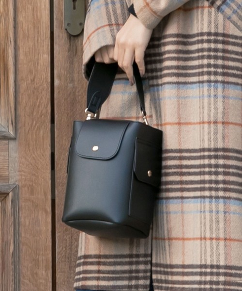 コロンとしたフォルムがカワイイバケツバッグ。大人っぽいカラーバリエーションにゴールドの金具が上品な印象を引き立てます。サイドのポケットがトレンドライクなワーク感を演出します。【素材・サイズ感】 高級感のあるフェイクレザーを使用。雨や汚れにも強いので、デイリーユースにおすすめです。コンパクトながら大容量で荷物もしっかり入る縦長デザイン。両サイドフラップポケット付きなのでリップなどの小物の整理も◎。