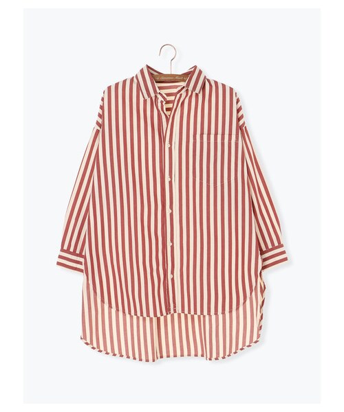 ストライプで仕上げた、モダンな雰囲気のチュニック。 オーバーサイズのゆったりシルエットで、肩の力が抜けてボディラインをカバーしてくれる効果も◎ 前後差のあるヘムのニュアンス感がアクセントに映え、ディテールにもこだわりの感じられるデザインです。