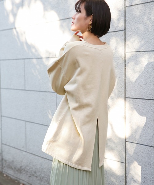 後に深めのスリットを入れて、袖にボリュームを持たせた 今年らしいデザイントップスにピグメント加工を施したトップス。 まるでヴィンテージのような雰囲気を出してくれるピグメント加工。 裏面は起毛をしているので暖かく、これからの時期に重宝するアイテムです。 ゆったりしたサイズ感で丈も少し長めにしているので安心して着て頂けます。 タイトスカートや柔らかなプリーツスカートなどとの合わせが今年らしくおススメです!! 【顔料染め(ピグメント加工)製品について】 顔料染めは糸(繊維)の内部に浸透しているのではなく、表面に付いている状態です。 そのため、着用や洗濯で摩擦されると顔料が落ちやすく色落ちしていきます。