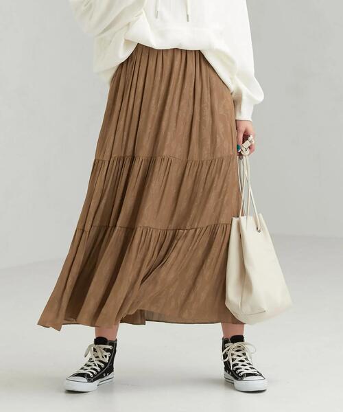 この春大活躍間すること違いなし!フェザー柄のジャカード素材でマキシ丈スカートをデザインしました。程よい光沢と落ち感がポイントのカッセン素材&ふんわりと広がるティアードデザインがポイント♪ウエストはゴム仕様なので、履き心地も楽々です。フェミニンなニット合わせはもちろん、スウェットやGジャンなどと合わせた大人カジュアルな着こなしもおすすめです!本体:手洗い可能※画像の商品はサンプルです。実際の商品と仕様、加工、サイズが若干異なる場合がございます。※照明の関係により、実際よりもやや明るく見える場合がございます。またパソコンなどの環境により、若干製品と画像のカラーが異なる場合もございます。予めご了承ください。店舗へお問い合わせの際は、全国のgreen label relaxing各店舗まで下記の品名/品番をお申し付け下さい。品名:CFC PEカッセンJQギャザーマキシSK 品番:3624-106-1906