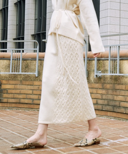 カジュアルなアイテムながら大人っぽく着こなせるニットスカート。 幅広なウエストゴム切り替えでフィット感がありながら、ノンストレスな着心地。 すっきりとしたタイトなシルエットに、センターで無地と凹凸感のあるアラン柄の切替デザインがこなれ感を演出する1枚。 同素材のストレッチ紐ベルト付カーディガン(品番:DDZ1092505A0011)とセットアップで着ていただくのがおすすめです。