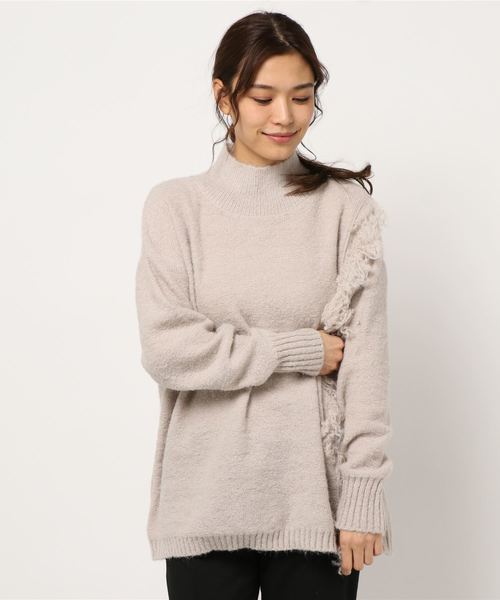 アシンメトリーについたフリンジがアクセントになったニットトップス。ほど良いハイネックデザインで首周りもあったかなのも嬉しいポイント。この1枚でシンプルながらコーデのポイントになる秋冬のいちおしアイテムです。【素材・サイズ感】少し起毛感のある肌触りの良いニット素材。ゆったりシルエットとドロップショルダーがリラックスした着心地。インでもアウトでも着こなしやすい丈感が魅力。