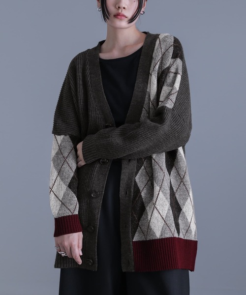 ■デザインアシンメトリーに施したアーガイル柄と配色が、個性的でモードな印象のカーディガン。ゆるっと着られるシルエットがこなれ感をプラスします。ユニセックスで着られるデザインとサイズ感も嬉しいポイント。■コーディネート主役級になるデザインのカーディガンなので、シンプルなトップスやボトムスを合わせるだけでスタイリングが完成。ボタンを開けてゆるっと羽織るだけでもバランス良く決まります。■素材パーツごとで編み方や柄を切り替えたこだわりのニット。程よい厚みと肌触りの良い生地感で、ロングシーズン心地よくご着用いただけます。【ニット製品につきまして】ニット製品は、身体に自然と馴染む伸縮性が特徴となります為、編み上げる行程やプレス仕上げによって多少サイズや風合いの個体差が生じる場合がございます。また、着用の際ピリングが避けられず、完全に防止することはできません。ピリングができましたら、引っ張ろうとせずハサミや毛玉取り器で丁寧に取り除いてください。ニット素材の持つ特性となります為ご了承の上ご購入いただきますようお願いいたします。