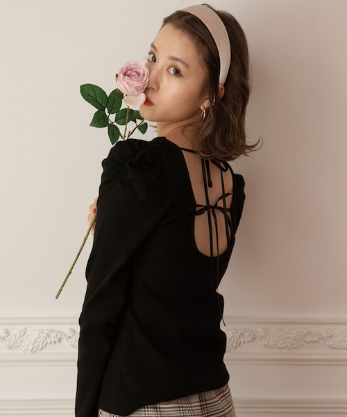 バックのあき具合とリボン使いが印象的なパワショルトップス。 コンパクトなサイズ感で、上半身を美しく魅せてくれます。 ミニボトムやロングスカートなどの女性らしい ボトムにインしたスタイリングがおすすめです。