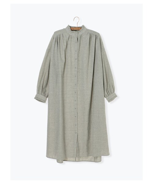 スタンドカラーや袖口のフリルが愛らしい表情をプラスするクラシックワンピース。 ヨークにギャザーをたっぷりと入れた、柔らかに揺れるドレープシルエットがフェミニンな印象◎ 1枚でさらりと着るのはもちろん、手持ちのベルトでウエストマークしたり、前を開けて羽織り代わりにと、様々なコーディネートが楽しめます。