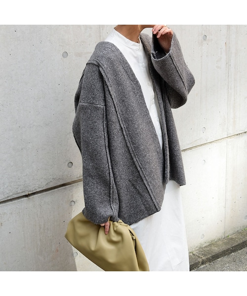 ◆アイテム詳細◆ ざっくりとしたボリューム感でデザイン性と保温性を兼ね備えたニットコート。 しっかりとした肉厚素材なニットでワイドなスリーブラインに後ろに抜いても着れるデザイン。 シンプルながらに雰囲気のあるシルエットが魅力。 スキニーやストレートパンツでメリハリを付けたり、ワイドパンツとのルーズコーデ等幅広く着回しの効くデザインもポイント! 寒い時期は、ライダースetc、タイトなアウターを1枚中に重ねたスタイリングもおススメです。 ーーーーーーーーーーーーーーーーーーーーーーー 【COLOR】ベージュ・チャコール 【SIZE】Fサイズ 平置き(㎝) 着丈71 身幅63 肩幅58 袖丈45 裾幅64 袖口22 【素材】本体 アクリル90% 毛10%
