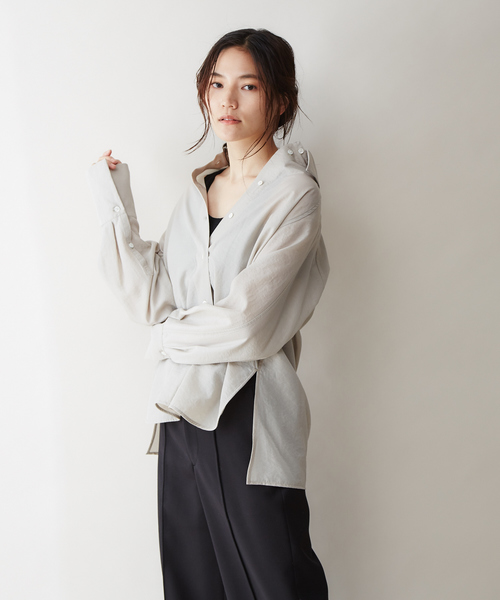 ヘルシーな雰囲気漂うシアーシャツ *Detail* ・メンズライクな佇まいが、女性らしさを引き立たせるシャツブラウス。 ・ラグランスリーブでルーズ感のあるシルエットに。 ・深く入れたサイドスリットや裾ラインが着こなしの幅を広げます。 *Coordinate* 襟を抜いてルーズに着ると、ヘルシー感のある大人カジュアルスタイルに。 まだ肌寒い季節には、ニットとのレイヤードスタイルがおすすめ。 程よいシアー感が透明感のある雰囲気を演出してくれます。 シアー感も有りながら程よいナチュラルな風合いが魅力。 シワになりにくいのも特徴です。 ご自宅で手洗いが可能です。 洗濯:手洗い可